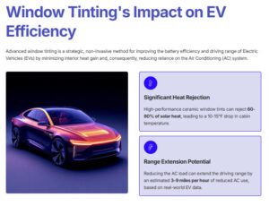 - AC use drains 10-15% of EV battery range; reducing heat gain via tinting can extend driving range by 3-9 miles per hour of reduced AC use (Tesla Model S data).